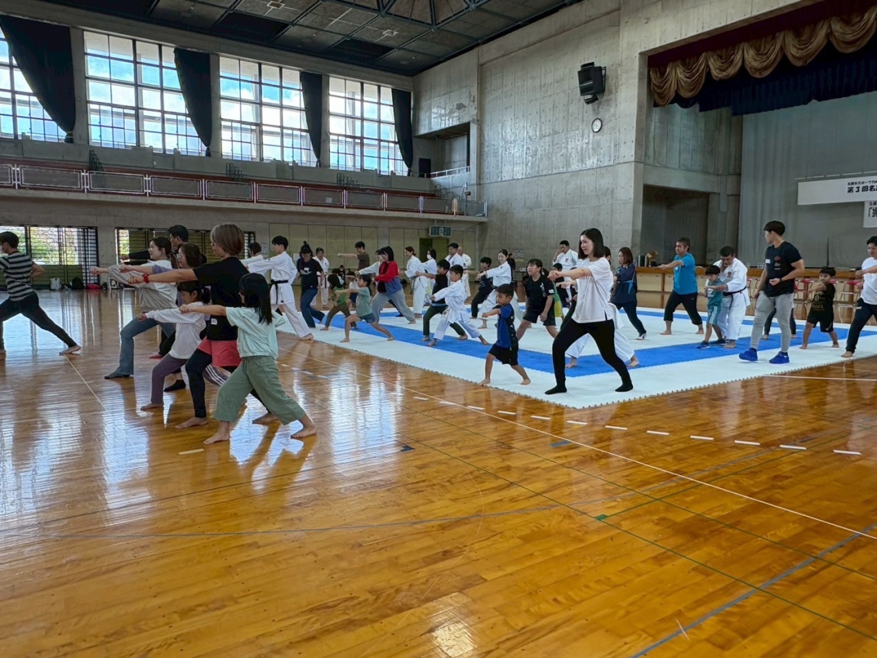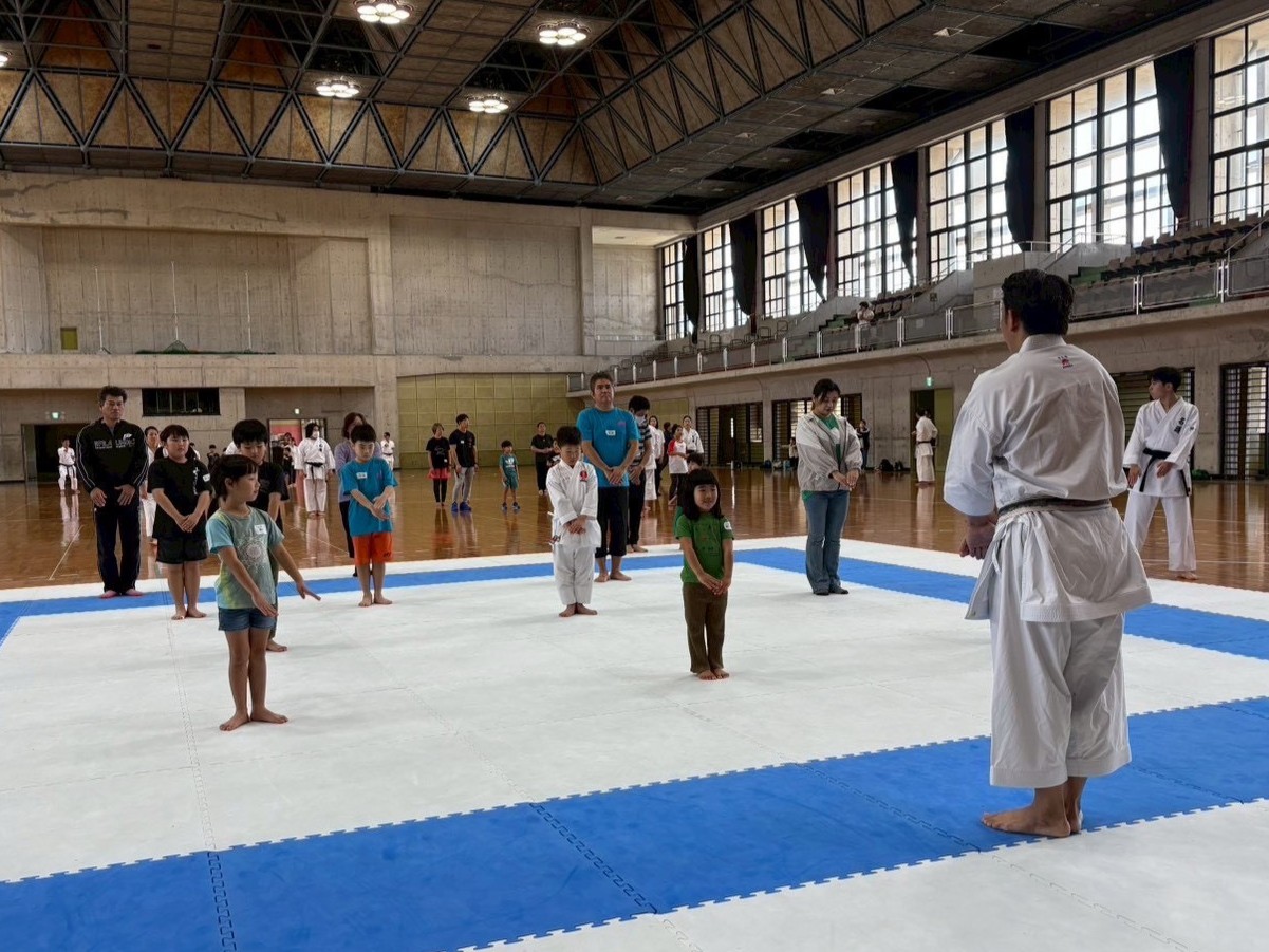 5歳以上から小学生の親子を対象に、空手の動きを使った健康体操や簡単な動きの基本形、グループに分かれての団体形演武などを通して、楽しみながら空手を体験していただきました。