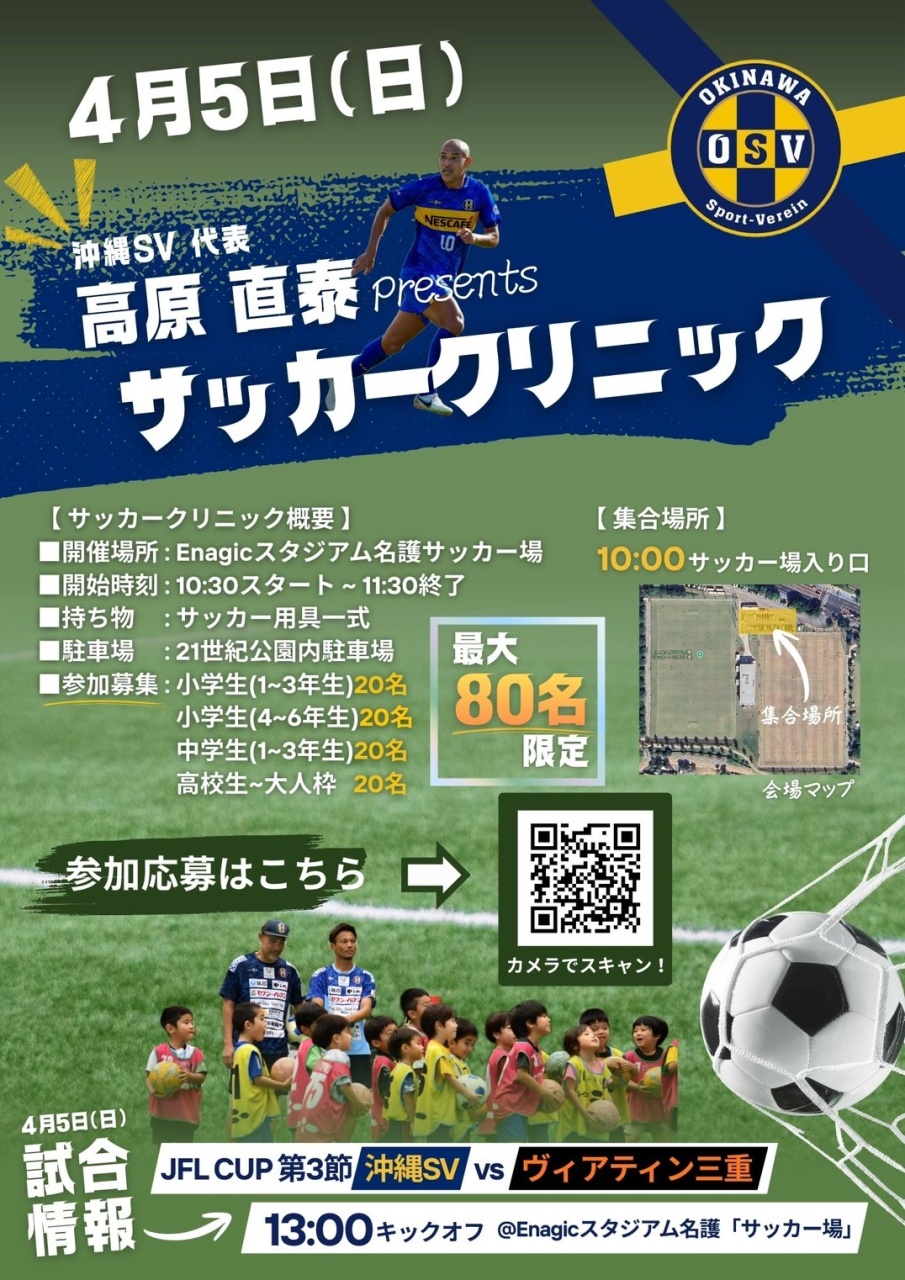 令和8年4月5日(日)、Enagicスタジアム名護サッカー場にて「高原直泰presentsサッカークリニック」が開催されます!