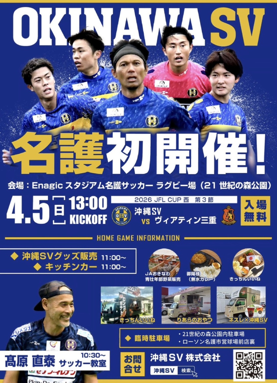 令和8年4月5日(日)Enagicスタジアム名護サッカー場にて、沖縄SV vs ヴィアティン三重の試合が開催されます。