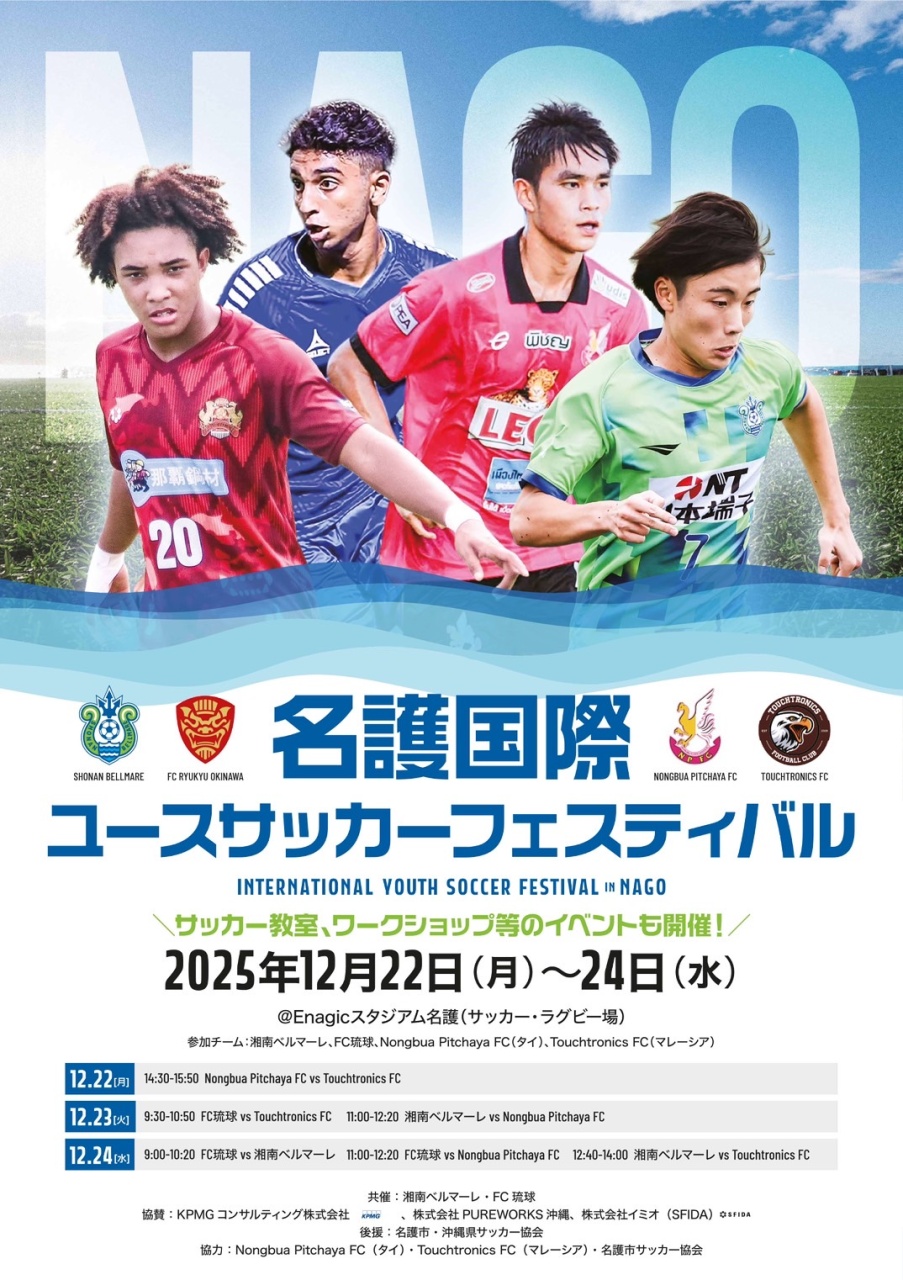 名護市サッカー協会よりお知らせです。来る令和7年12月22日(月)~24日(水)、Enagicスタジアム名護サッカー・ラグビー場にて、湘南ベルマーレとFC琉球の共催イベント「名護国際ユースサッカーフェスティバル」が開催されます。