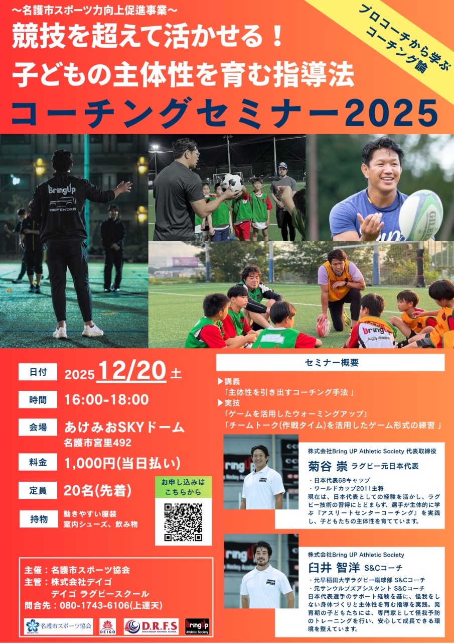 2025年12月20日(土)、あけみおSKYドームにて、コーチングセミナーが開催されます。様々な競技に活用できる子どもの主体性を伸ばす指導法について、プロコーチにから学べるセミナーとなっております。