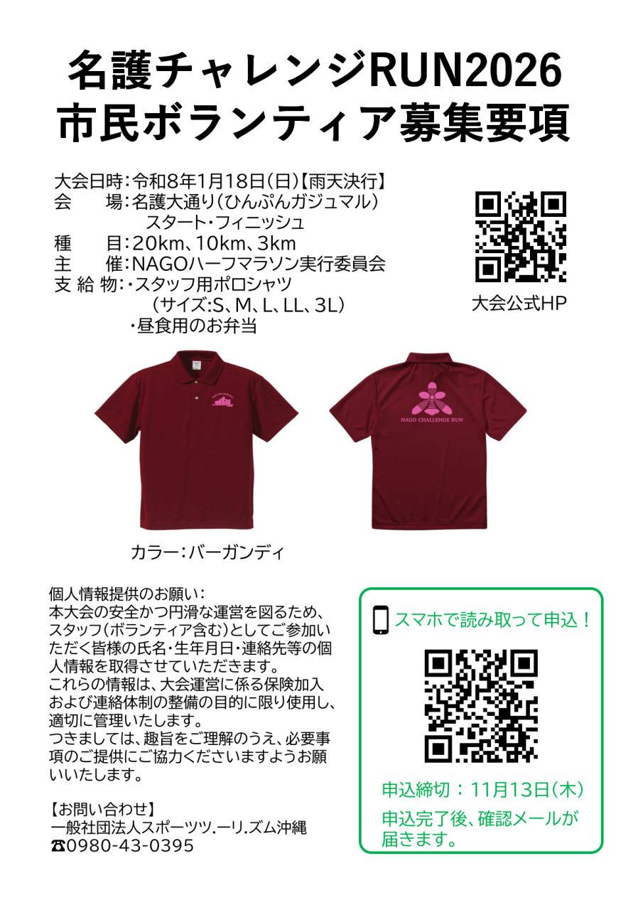 2026年1月18日(日)開催予定の「名護チャレンジRUN2026」へご協力いただける市民ボランティアを募集いたします。ご協力いただける皆様には、大会特製のスタッフ用ポロシャツをお渡しさせていただきます!