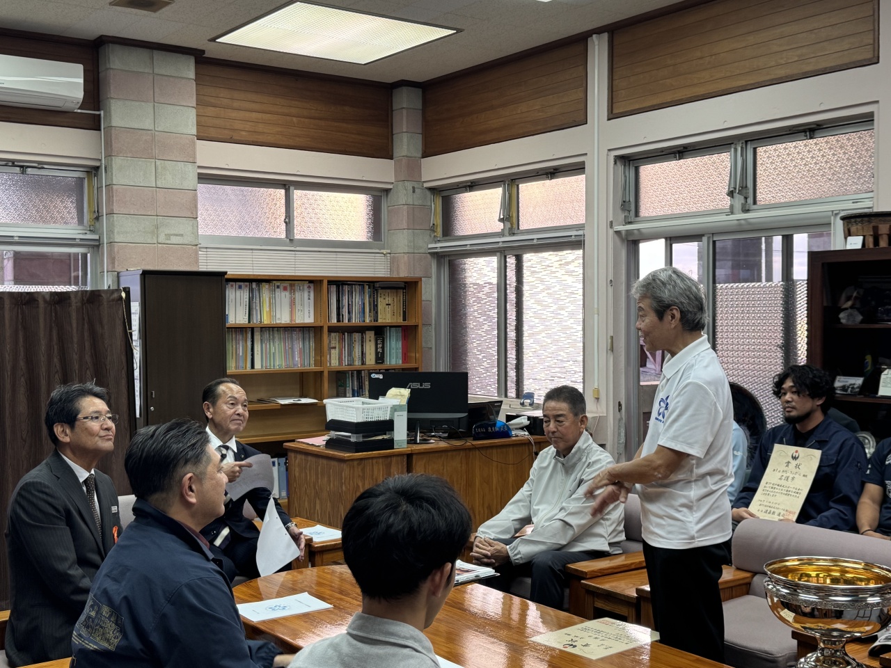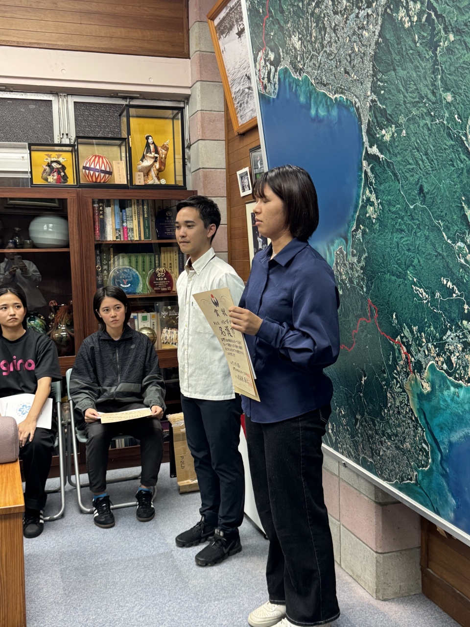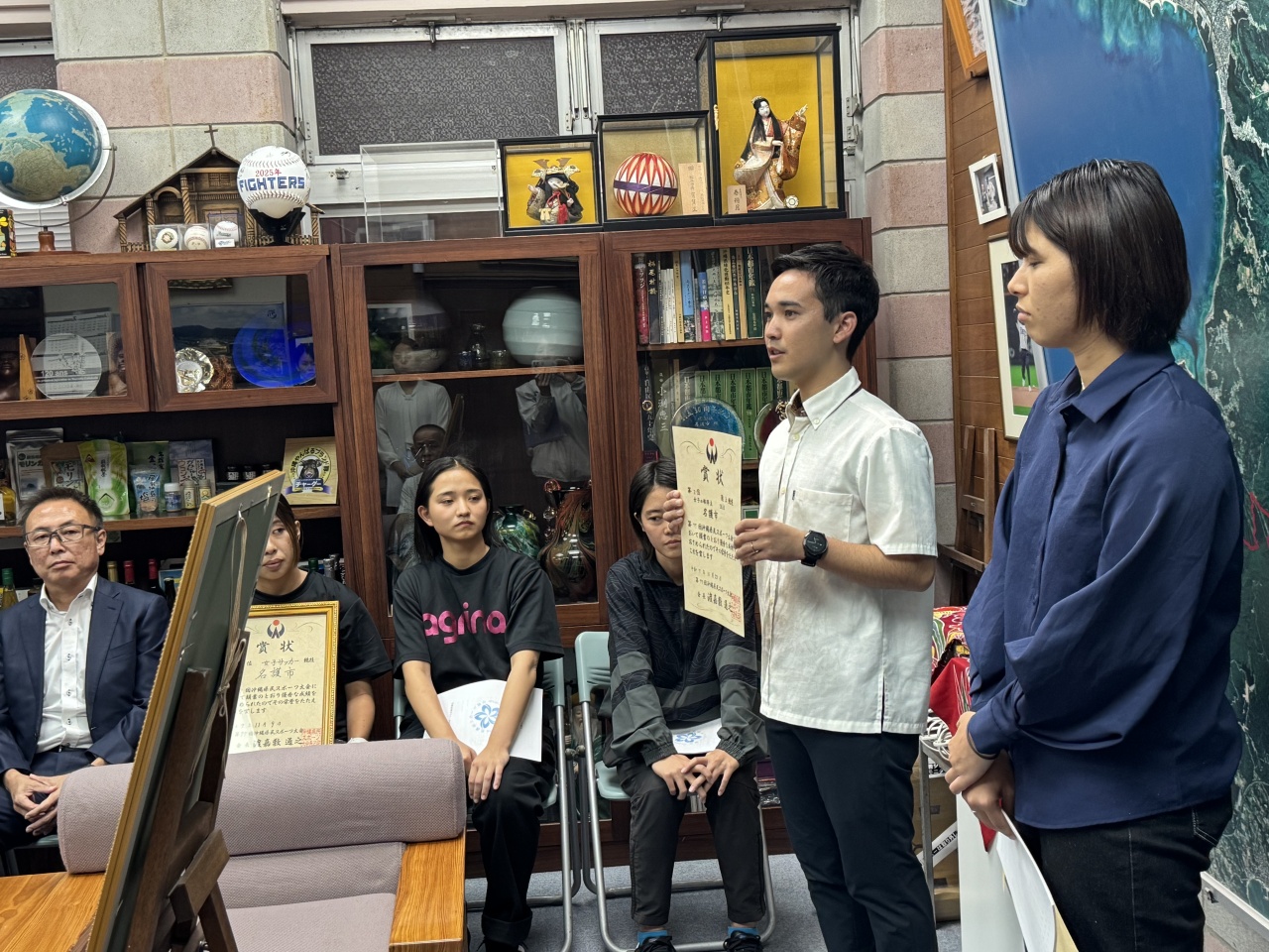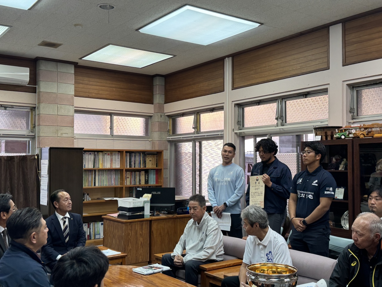 第77回沖縄県民スポーツ大会へ出場し好成績を収められた選手の皆様が、去った11月26日(水)に渡具知市長を表敬訪問されました。第77回沖縄県民スポーツ大会においては、名護市選手団からラグビーフットボール競技が8大会連続18回目の優勝を果たしたほか、サッカー競技男子が32年ぶりの優勝、サッカー競技女子も非採点競技ながら優勝を果たしました。