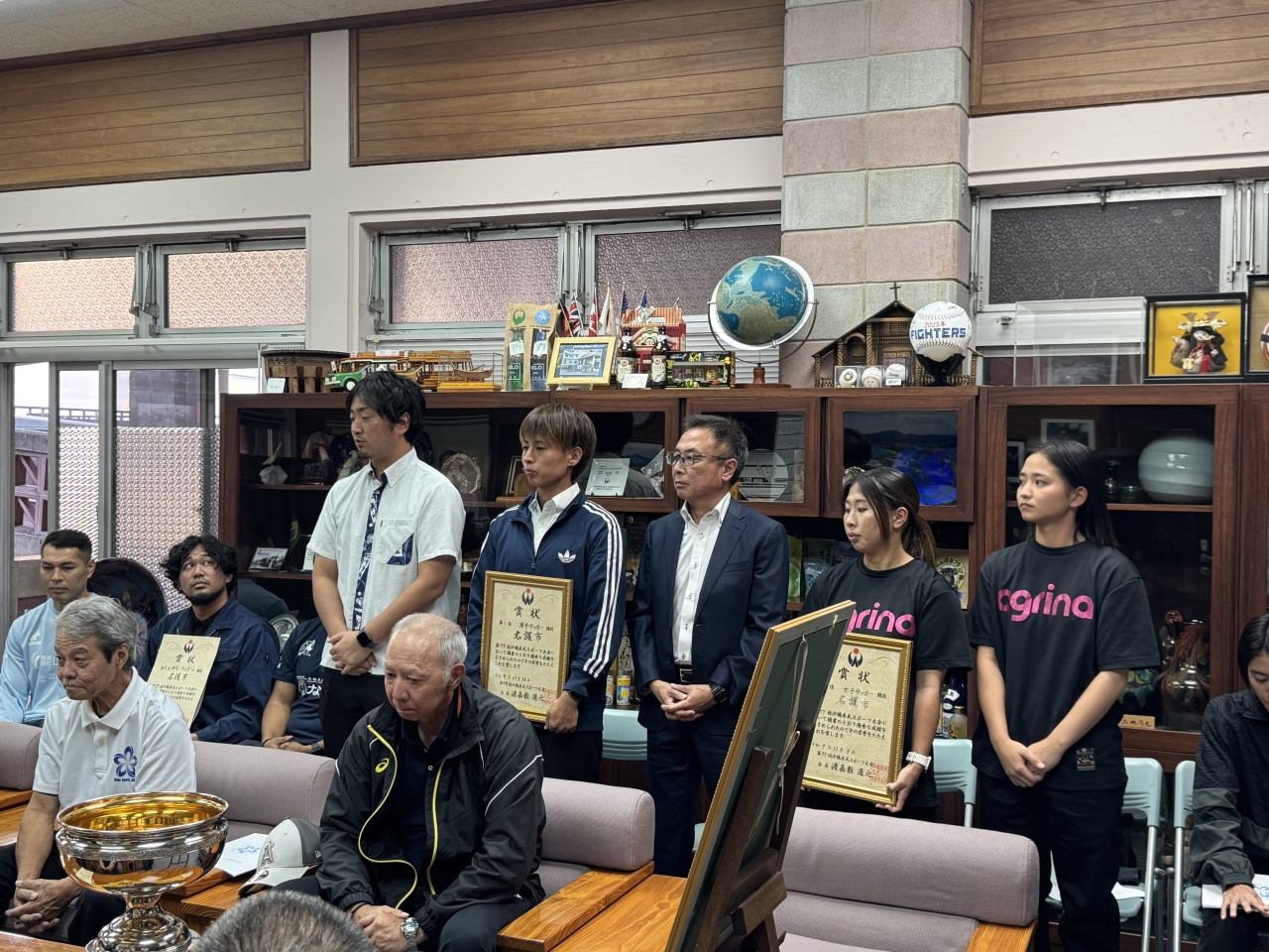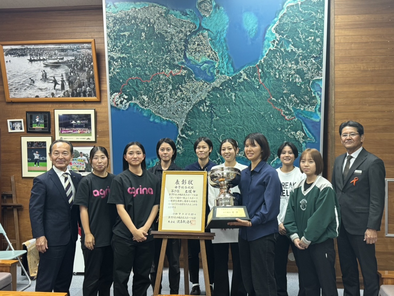 去った令和7年11月5日(水)、名護市民会館中ホールにて、沖縄県民スポーツ大会名護市選手団団結式と令和7年度年間表彰を行いました。先行で開催されていたラグビーフットボール競技の皆さんからは、8大会連続18回目の優勝を成し遂げられたご報告もあり、名護市選手団の士気を高めてくださいました!